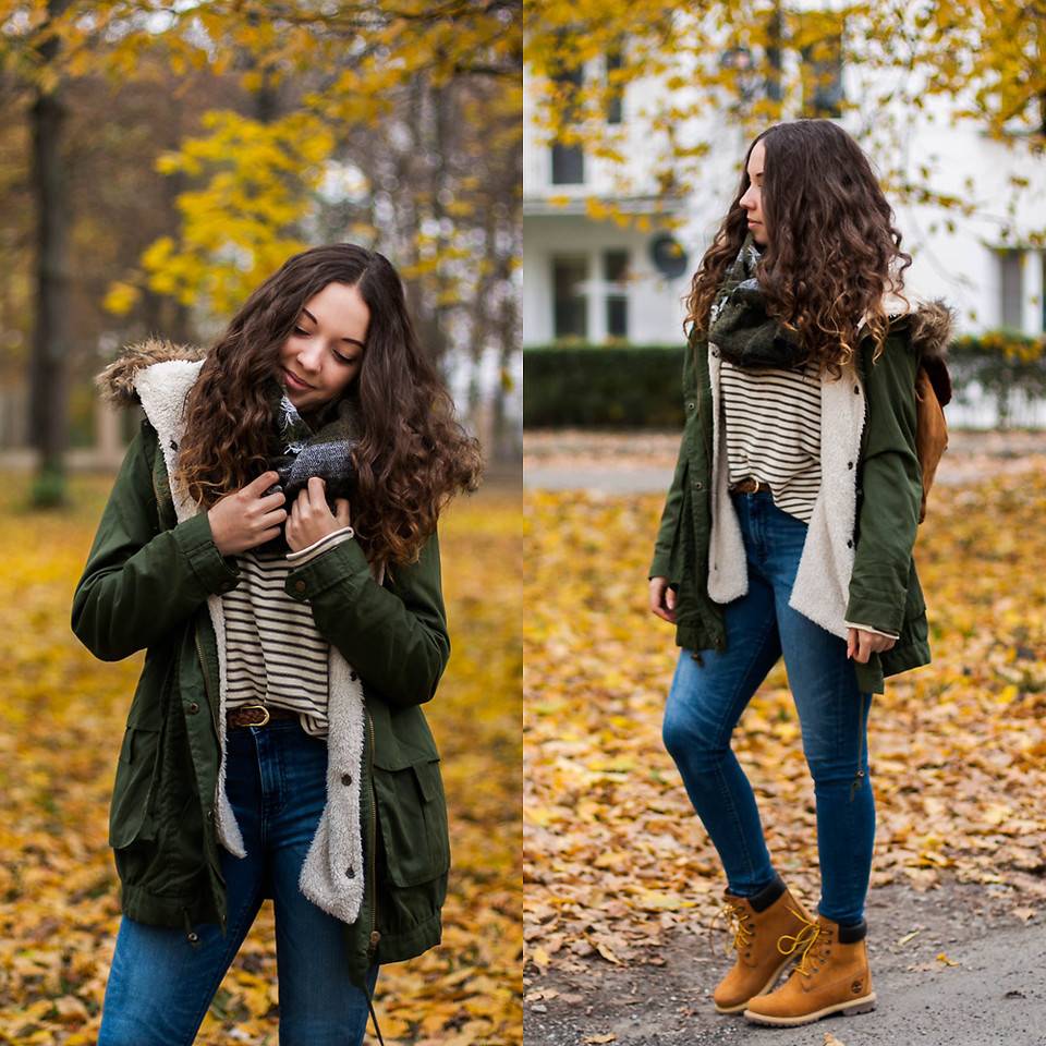 Молодежный образ в уличном стиле – парка традиционного зеленого цвета, джинсы, полосатый лонгслив