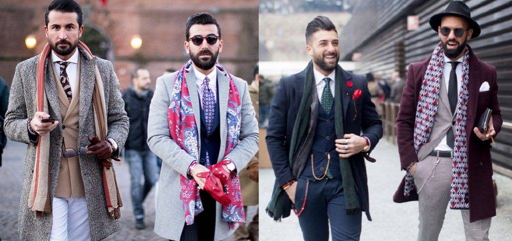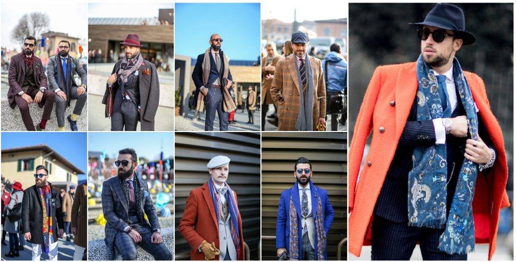 Шарфы – это основа зимного гардероба, но в данном случае они выполняют не только согревающую функцию. Мужчины на Pitti Uomo носили длинные драпировочные шарфы, которые подчеркивали их лук, а иногда становились ярким «пятном», добавляя визуальный интерес к их одежде. Расположение фантазийного принт-платка вокруг шеи – отличный способ получить стильный эффект и смягчить однотонные краски ансамбля. Чтобы максимально вписатися в общий look, лучше будет если оттенки аксессуара частино переплетутся с мелкими деталями: галстуком, перчатками, шляпой, нагрудным платком.