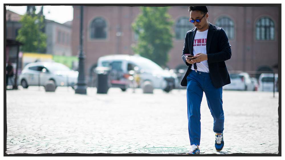 В качестве брюк были выбраны чинос насыщенного синего цвета, которые добавляют яркую нотку в образ. Что касается обуви, то оптимальным вариантом стали кроссовки в ретро стиле. И это правильный выбор, так как кожаная обувь вряд ли бы смотрелась с этим костюмом.