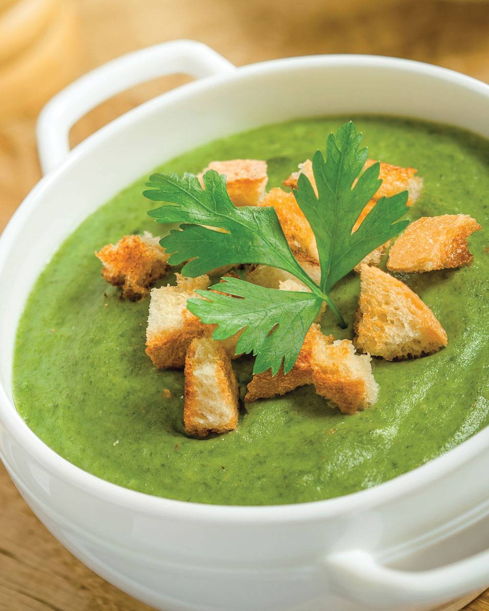 Обжарьте лук на масле и натрите имбирь. Подогрейте овощной отвар и опустите в него брокколи, разделенную на соцветия. Добавьте поджаренный лук, тертый имбирь, соевый соус и сахар. Оставьте суп на 7 минут, а в это время займитесь хлебом. Его нужно нарезать кубиками, смешать с тертым чесноком и обжарить. Параллельно необходимо отварить креветки в отдельной кастрюле. Через 7 минут закиньте в суп листья шпината, влейте сливки и снимите с огня.
