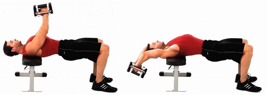 Нужно лечь перпендикулярно скамье так, чтобы тело напоминало мостик с опорой на стопы и верхнюю часть спины. Гантель берут двумя руками «в замок» и практически на прямых руках поднимают над грудью. В этом положении таз располагается ниже уровня плечевого пояса, и широчайшие мышцы получают хорошую нагрузку.