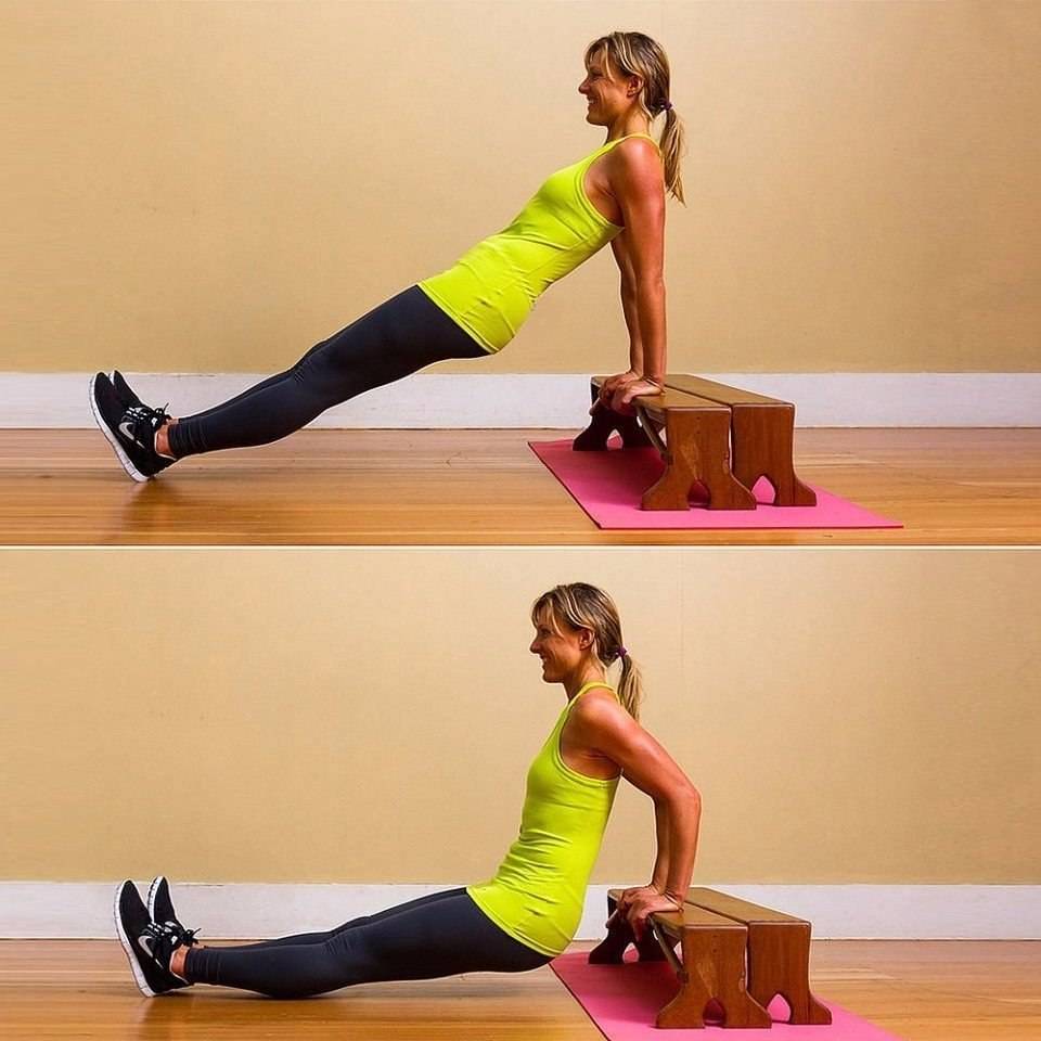 Техника выполнения: упор сзади на ладони на краю скамейки, а также на пятки. Ягодицы направлены в пол. На выдохе – согнуть руки в локтях до образования прямого угла. На выдохе – вернуться в ИП, выталкивая себя наверх с помощью трицепсов.