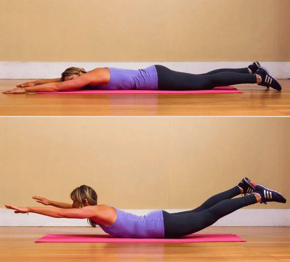 Техника выполнения: лежа на животе, руки вытянуты вперед. На выдохе поднять голову, руки и ноги. Конечности удерживать прямыми. Задержаться в позиции 30-120 сек.