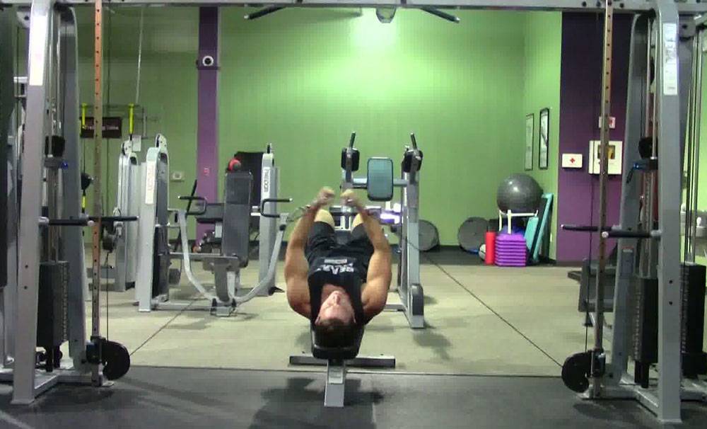 Подъем ног дает возможность убрать “мост”, прижимая спину к скамье. Запомните это! Что касается количества повторений, то их нужно сделать 6-12.