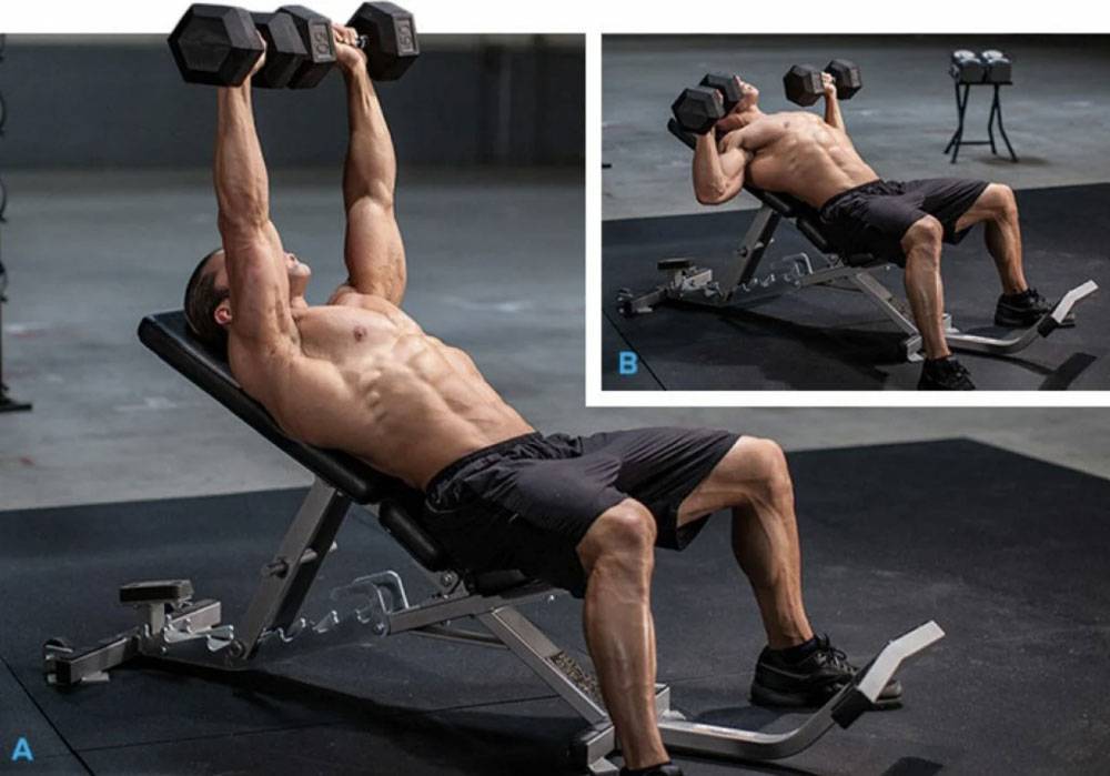 Разведение рук на наклонной скамье нагружает верхнюю часть груди так же, как и переднюю дельтовидную мышцу. Если вы чувствуете, что большую часть работы выполняет бицепс, поверните ладони внутрь или наружу, в зависимости от того, что лучше нагружает грудь.