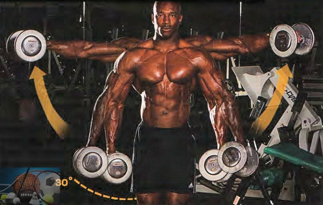 Отметим универсальность и комплексность воздействия, которые обеспечивает это технически несложное упражнение. Описанные нами занятия с гантелями развивают не только сами дельты, но и соседние трапеции, предплечье, способствует развитию передних мышц груди.