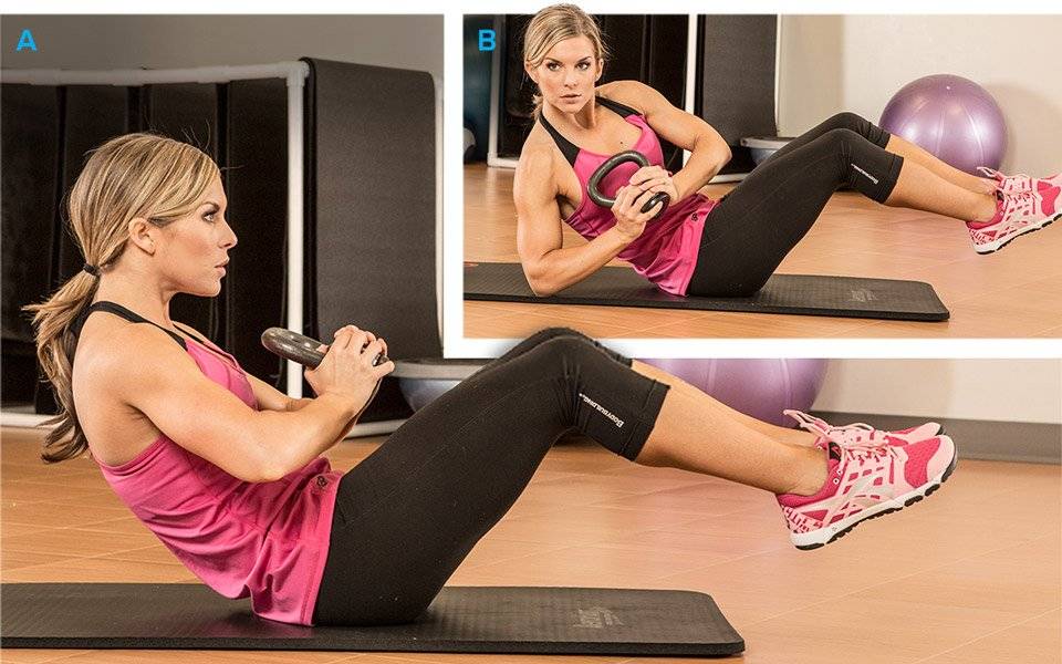 - Русские повороты туловища со снарядом. Если вы делаете без усилий 20 повторений, то есть смысл усложнить упражнение взяв в руки гантель или мяч. Делайте повороты, держа снаряд на вытянутых руках перед собой.