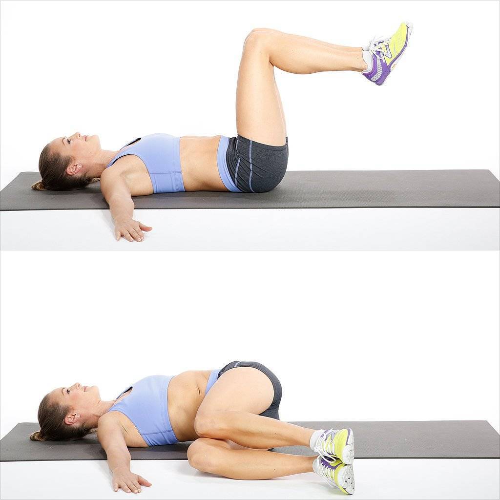 Необходимо лечь на спину и подняв ноги вверх, согнув их предварительно в коленях отводить поочерёдно в разные стороны, избегая изгибаний в области поясницы.