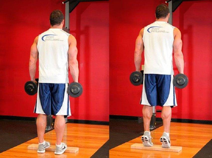 Вариант на одной ноге с одной гантелью или блином, и удержанием свободной рукой за вертикальную опору (стена или тренажер) хорош для создания симметричных икроножных, если у человека сколиоз, а также для разнообразия тренинга.