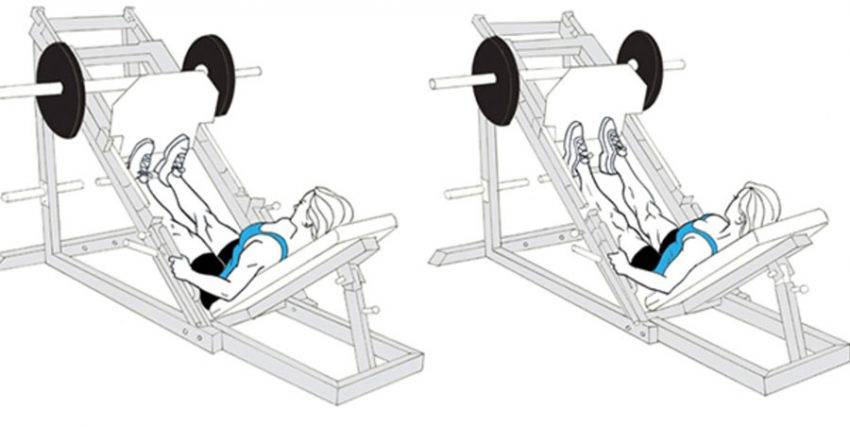 - Таз и спина зафиксированы и не отрываются в процессе опускания платформы вниз. Чтобы этого не происходило, нужно опускать платформу до образования в коленях угла в 90 градусов.