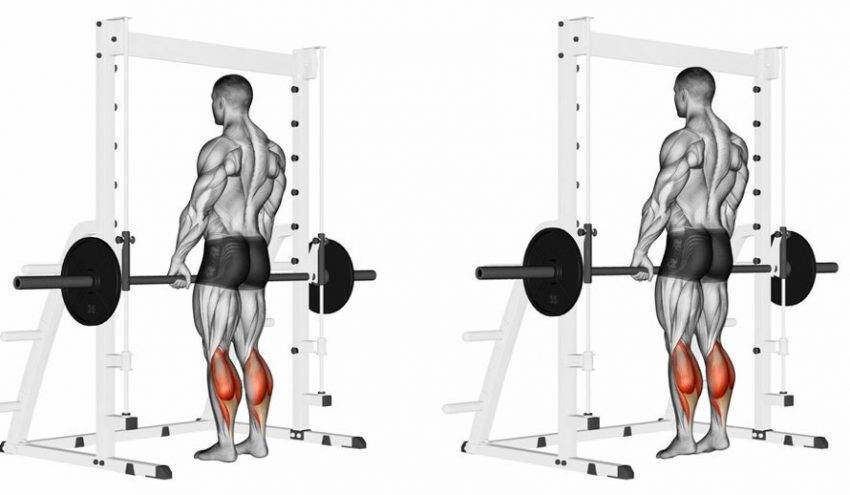 Подниматься на носки стоя можно в тренажере Смита, Гакк-машине, а также со свободными весами – штанга, гантели, сендбеги, гири.