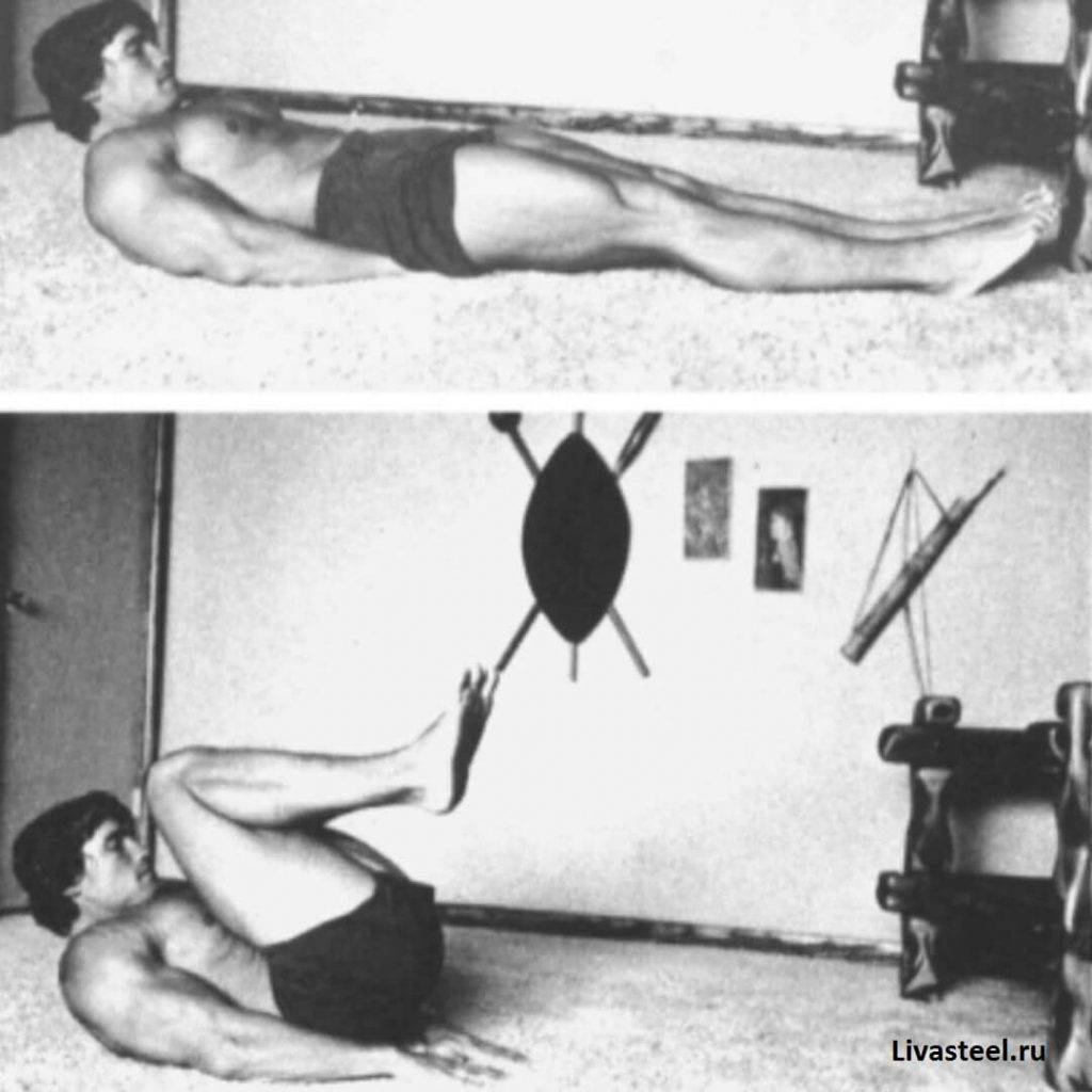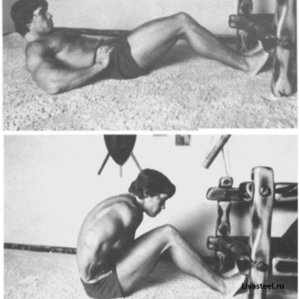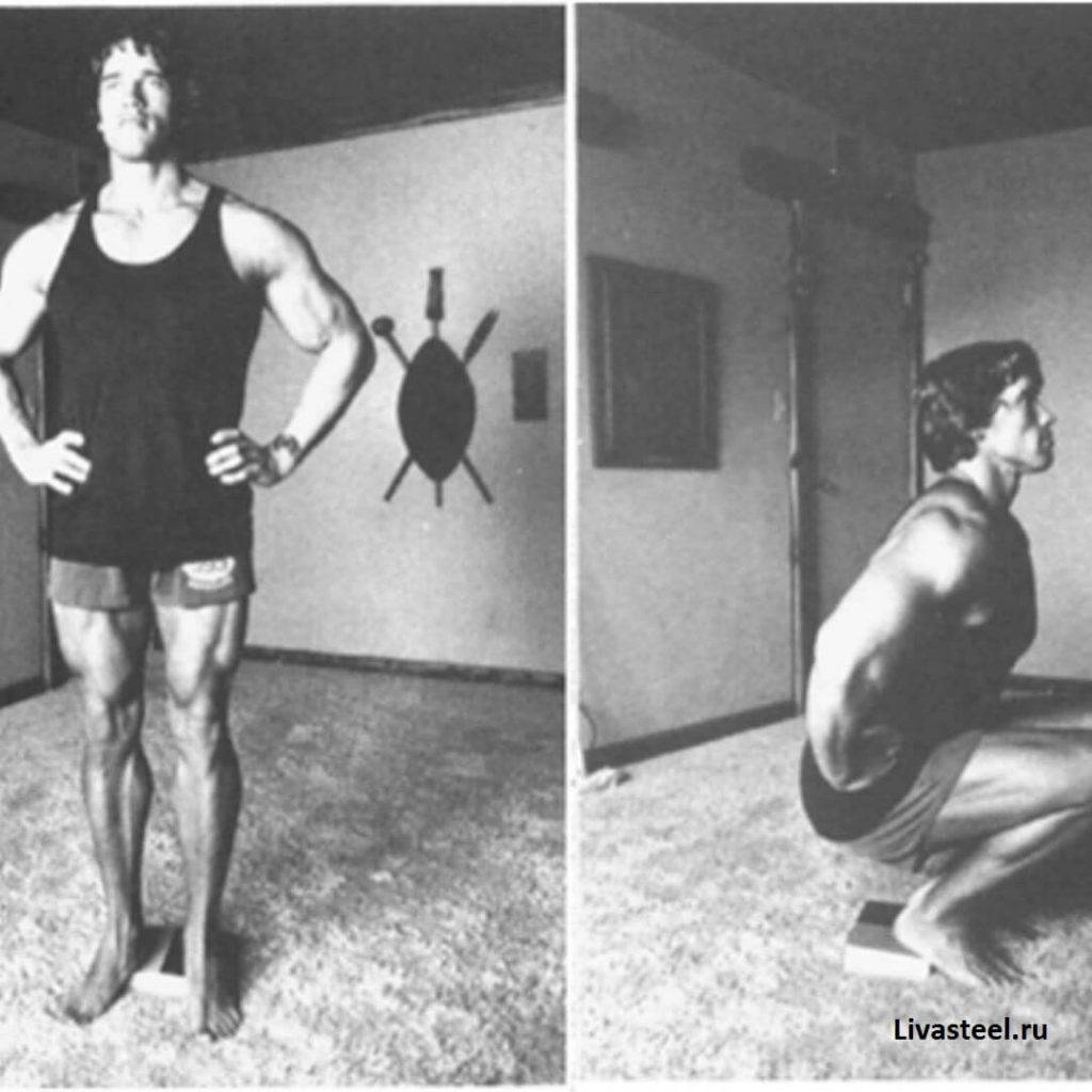 Арнольд любил использовать различные приседания и тренажеры для приседаний, работал стоя и лежа, чтобы иметь возможность менять положение стоп и досконально прорабатывать все мышцы ног.