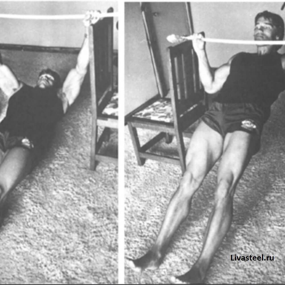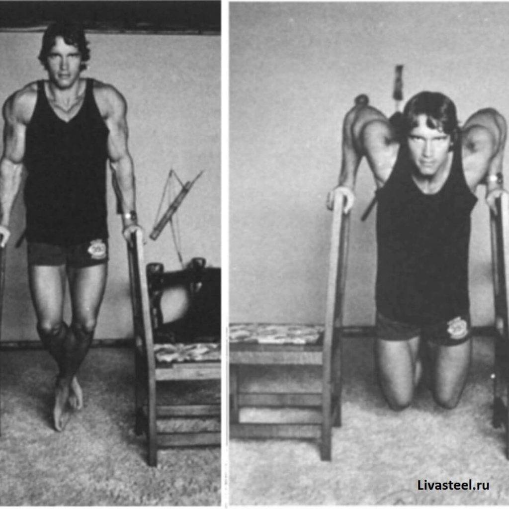 Это упражнение заменит отжимания на брусьях. Главное найти такие устойчивые стулья, как у Арни. Эти отжимания отлично проработают ваши плечи и трицепсы.