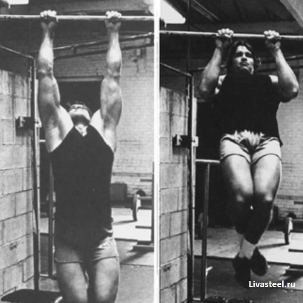 Известный “Терминатор” делал все упражнения в 5 подходов. Количество повторений старался удерживать в пределах 8-12 раз. Только становую тягу предпочитал делать на три подхода с меньшим количеством повторений.