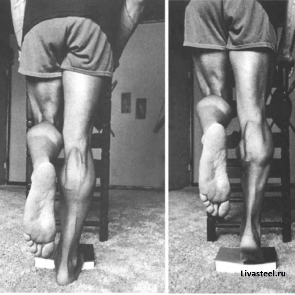 Отличное упражнение для икроножных мышц. Носком одной ноги необходимо встать на край возвышенности (ступеньки, книги и т.п.). Теперь вам нужно встать на цыпочки и опуститься вниз. Помним, что не менее 50 раз нужно сделать на каждую ногу.
