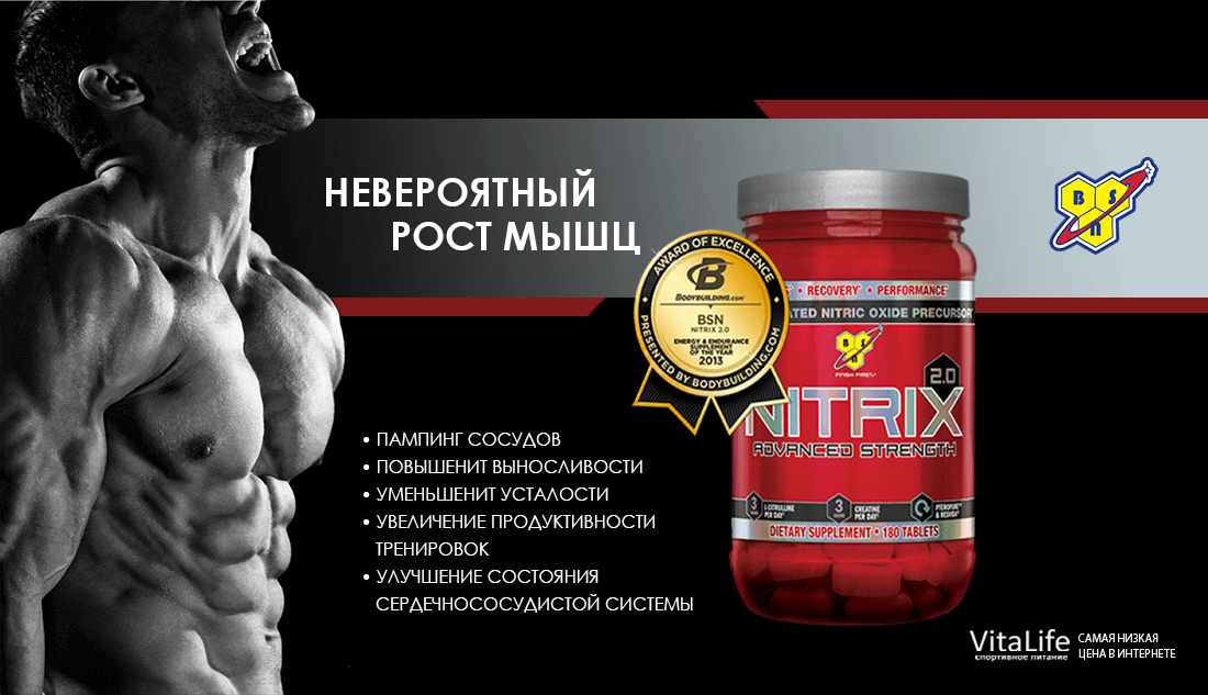 Nitrix 2.0 – один из самых популярных бустеров оксида азота от компании BSN для расширения сосудов, пампинга и улучшения питания мышц.
