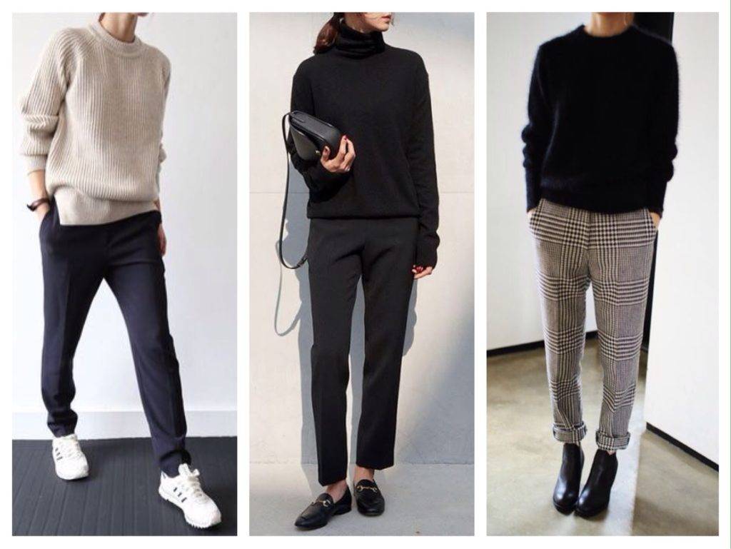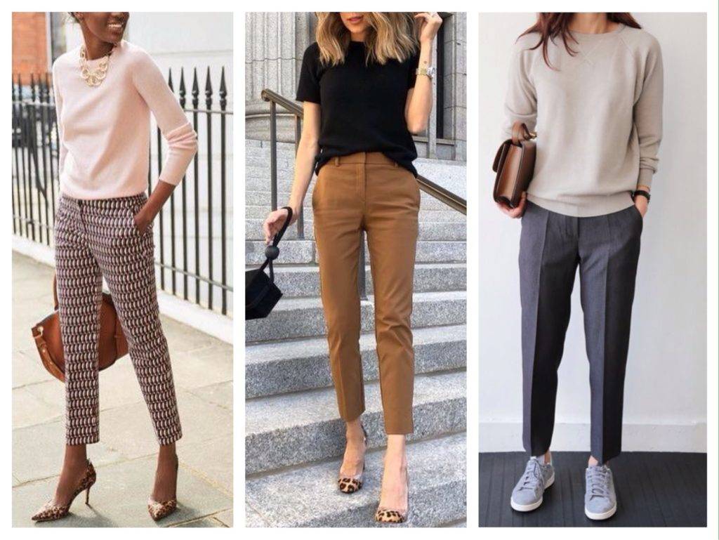 1–2–3 пары брюк, например: классические зауженные со стрелками, укороченные, брюки с высокой талией и свободного кроя с хорошей длиной (чтобы каблук был почти закрыт), строгие кюлоты. В моде также брюки из матовой кожи и эко кожи землистых оттенков. Такой вариант вполне уместен в офисе.
