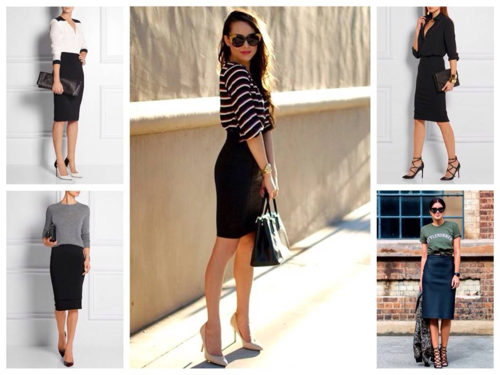 Юбка. Идеальный вариант — юбка-карандаш. Подойдет как прямая, так и обтягивающая модель. Они обе будут сочетаться с любой блузкой и подойдут к деловому образу. Посадка — также на ваше усмотрение. Рекомендуемая длина — чуть ниже колена. Но, например, юбка с завышенной талией будет смотреться выигрышно и в укороченном варианте, а обтягивающая юбка от бедер длинной ниже колена подчеркнет красоту ваших ног.