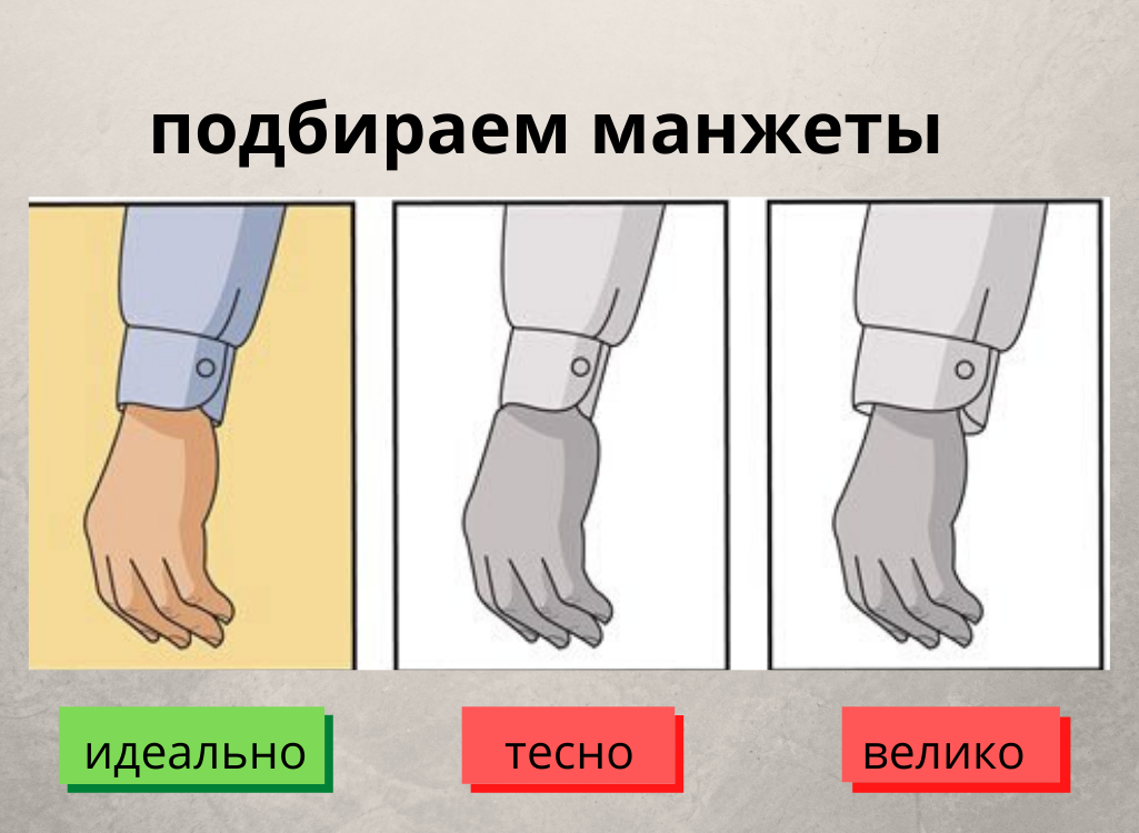 Идеально: манжеты плотно прилегают к коже, не пережимая ее и оставляя небольшое пространство между тканью и запястьями. Вы можете легко надеть или снять рубашку, не расстегивая пуговиц на манжетах. Если вы часто носите часы, выбирайте манжеты в соответствии с прибором.