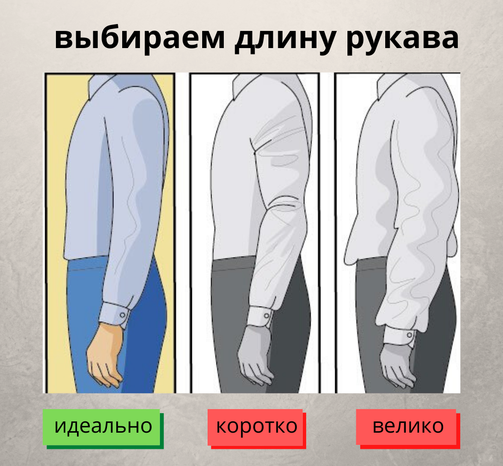 Слишком коротко: косточки запястья остаются открытыми, либо манжеты полностью прячутся под рукавом пиджака или куртки. В обоих случаях рубашка явно будет смотреться не очень, поэтому попробуйте примерить другую модель – с более длинными рукавами.