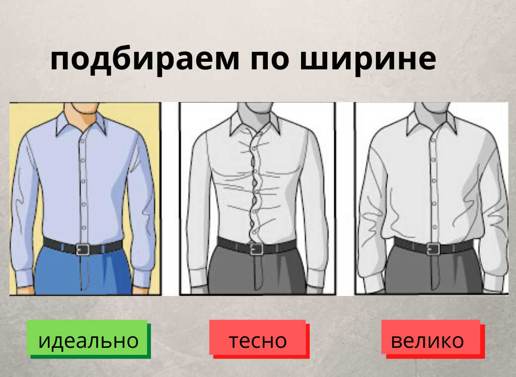 Ситуация усложняется, если фигура изменилась или телосложение сразу было нестандартным. Правильно подобрать рубашку в этом случае можно попробовать, заправив её в брюки и поднять руки. Выступающие над поясом края покажут, что одежда мала, а длина ниже ширинки – что слишком велика. Если всё нормально, сравнивают параметры воротника, рукавов, плеч и области груди.