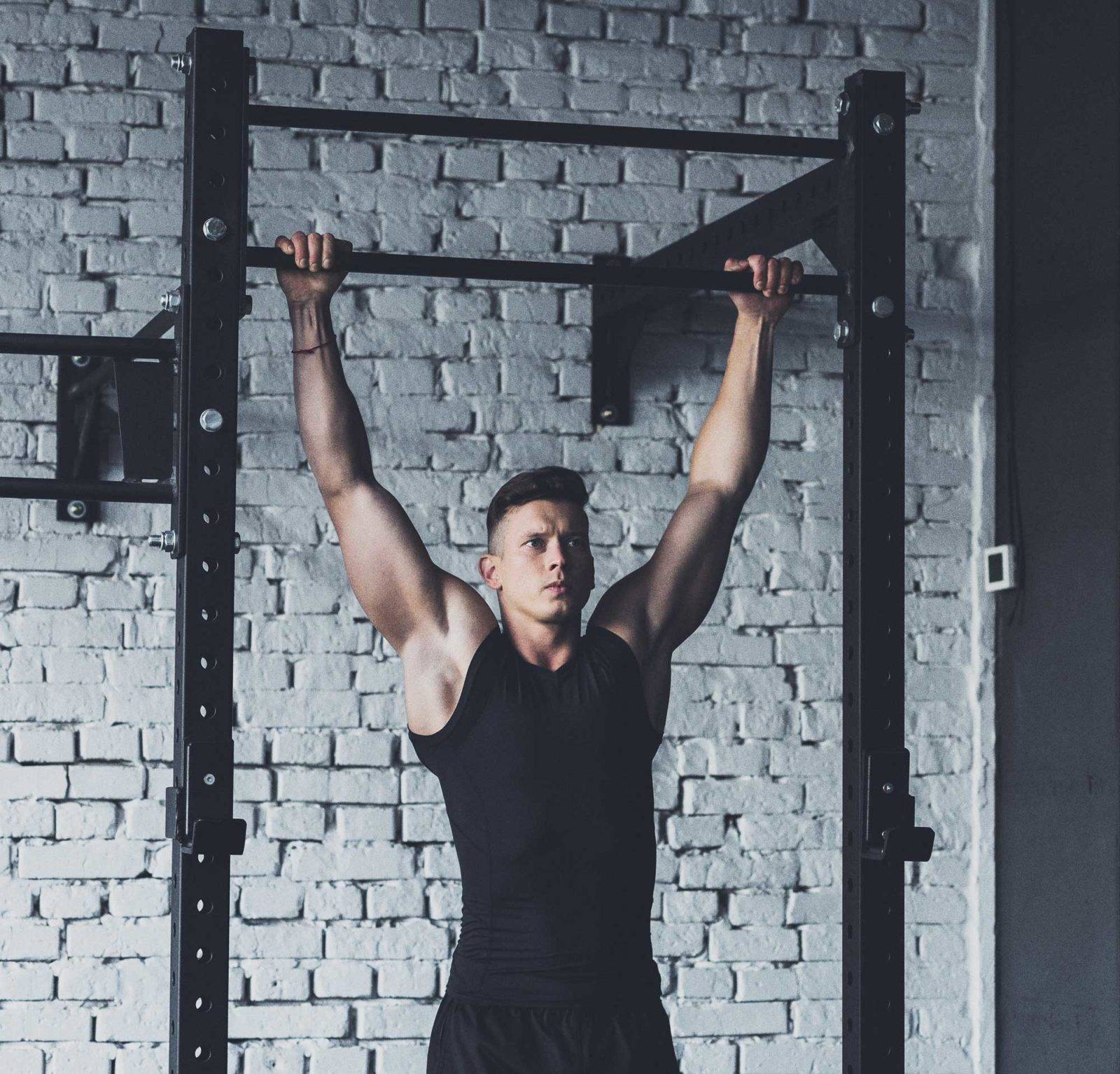 - Вис лицом к стене, локти согнуты под углом 90° – работают плечи.