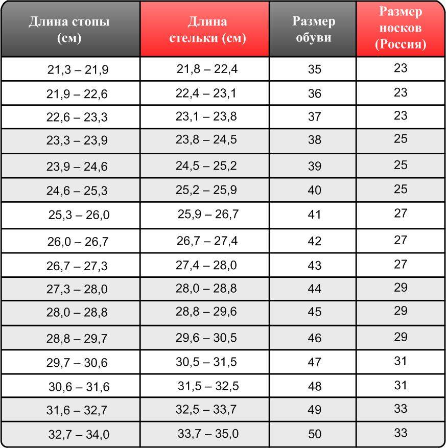 Так как носки эластичны и растягиваются, обычно на них стоит маркировка из нескольких цифр. Например, 23-25 или 29-31. Существуют специальные таблицы, по которым с легкостью можно определить, какой размер вам нужен.