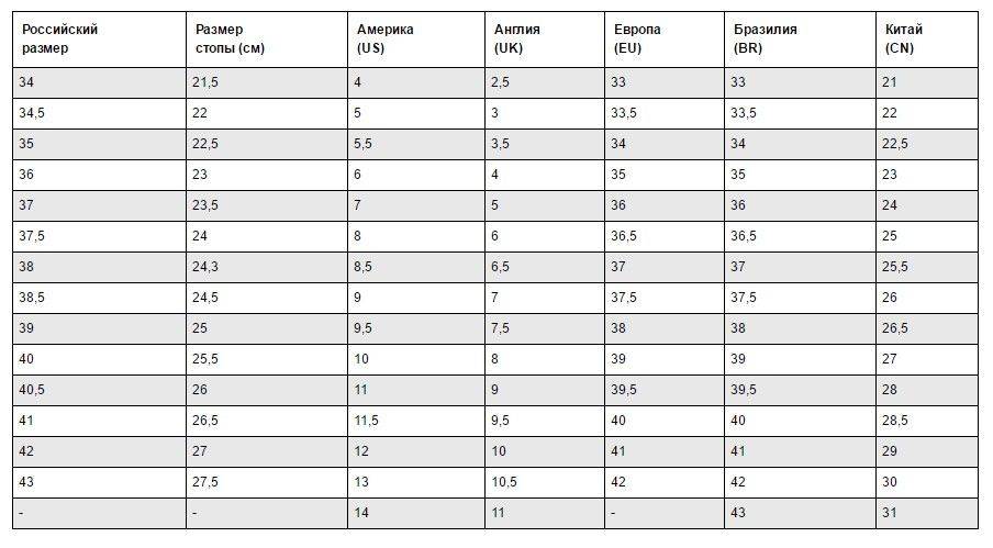 | Российская размерная сетка | Европейская (не соответствует маркировке в РФ) | Размер обуви (по штихмассовой системе) | Длина стопы |