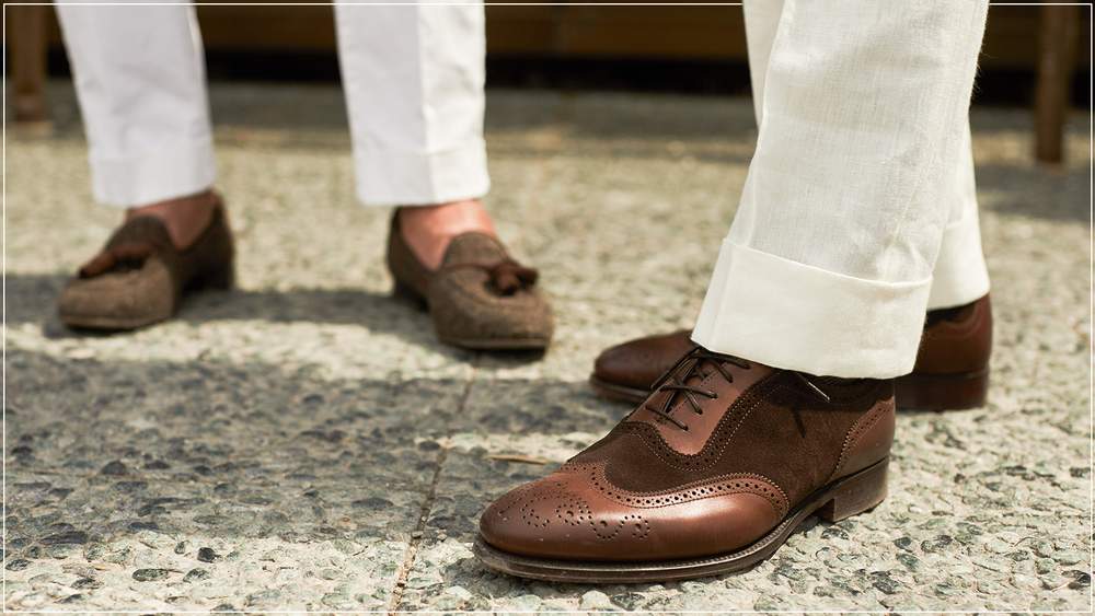 Легкое льняное полотно под ярким летним солнцем имеет тенденцию действовать как отражатель, вызывая блеск, глубину и текстуру твоей дополнительной одежды. Полюбуйся, например, как эти шоколадные туфли (в этом случае двухцветные броги) выделяются против щедрой манжеты безупречных белых льняных брюк.