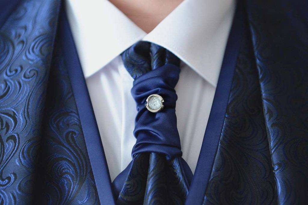 Пластрон – платочный аксессуар. Который больше используется как свадебный атрибут. Представляет из себя широкую полоску ткани, которая фиксируется брошью или декоративной булавкой.