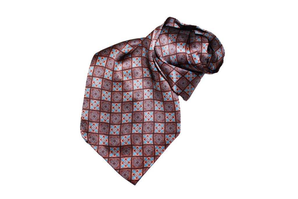Платочный аксессуар Аскот, всегда завязывается на шею под рубашку. Главное условие в использовании платка – это расстёгнутые первые две пуговицы на мужской сорочке. Уголки аксессуара полностью прячутся под тканью.