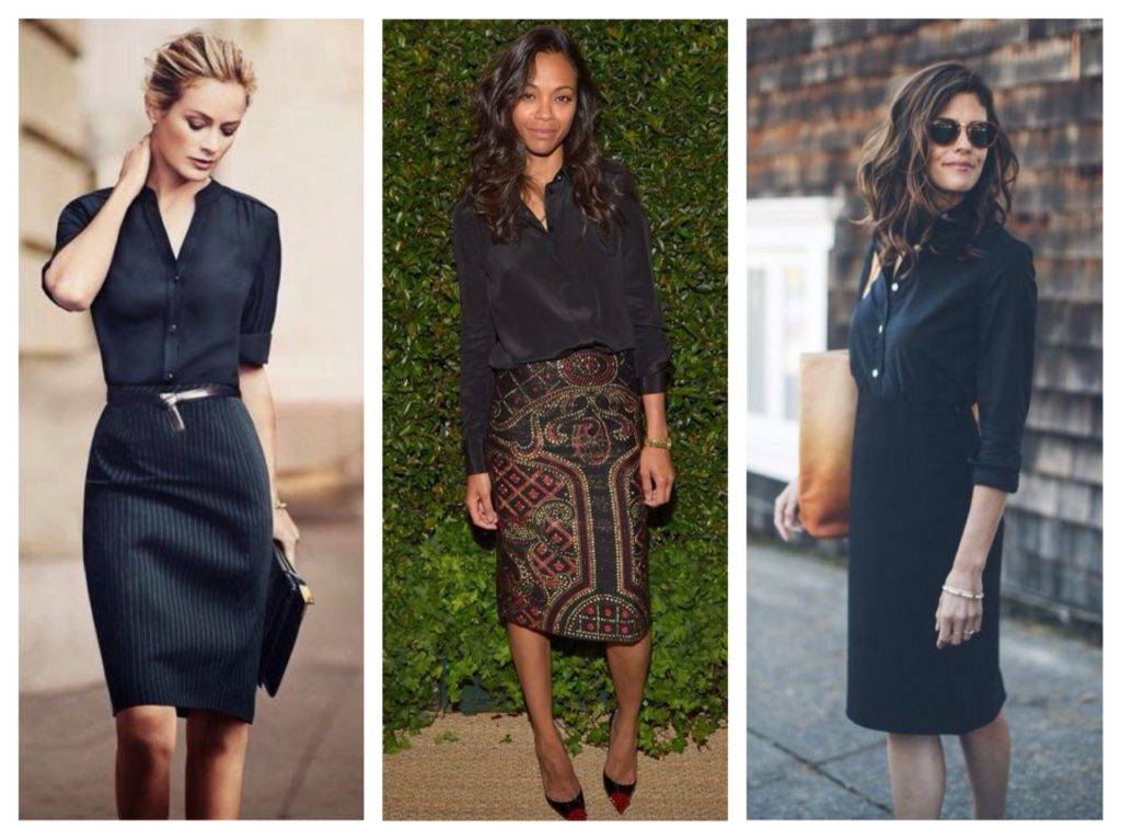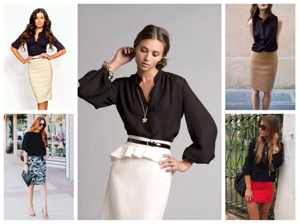Блузка часто ассоциируется с деловым образом, в том числе и чёрная. Конечно, если она не слишком прозрачная. Для офиса лучше всего подойдут такие комплекты: