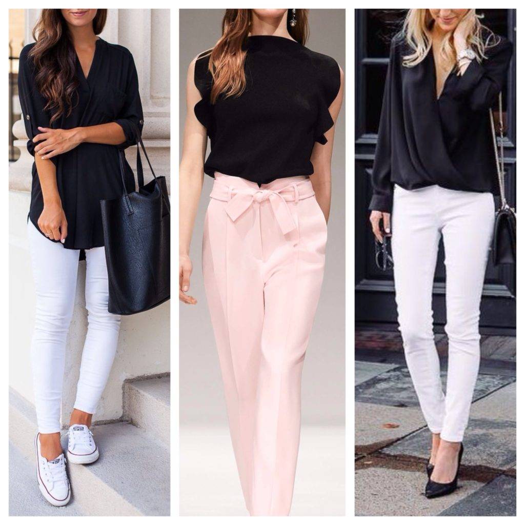 - Монохромные сочетания можно считать классическими. Но если это черная блуза и белая юбка или брюки, то комплект получится достаточно оригинальным, как показывают фото. Особенно эффектно он будет смотреться, если белый низ будет более объемным.