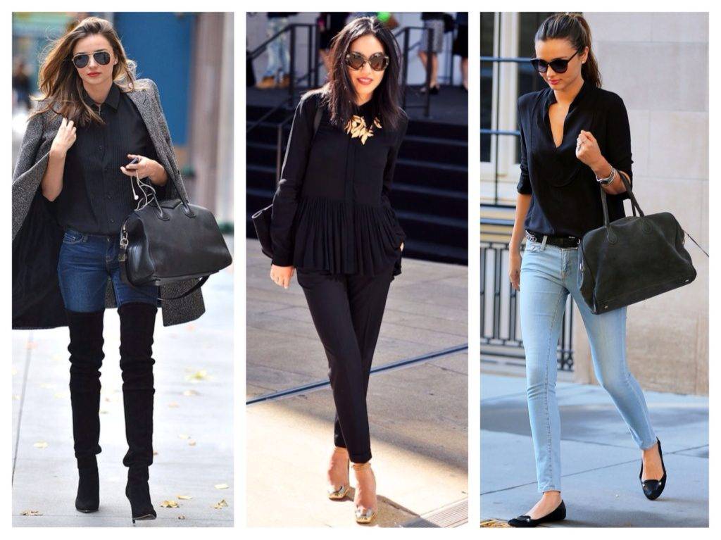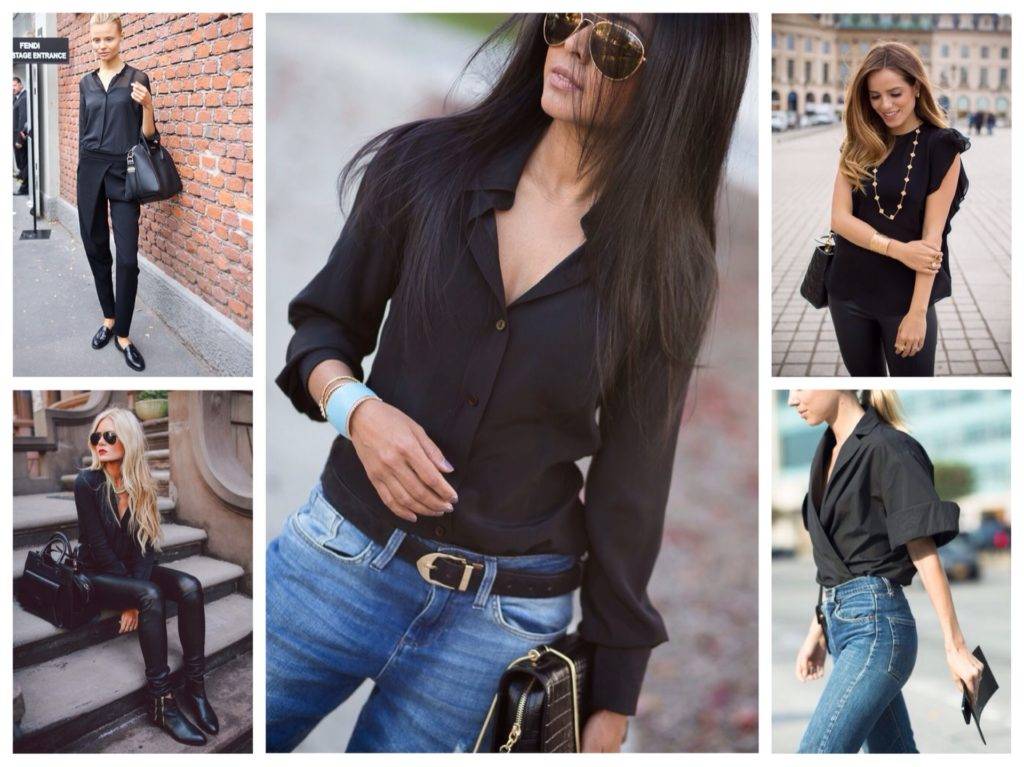 Несмотря на всю кажущуюся строгость этого предмета гардероба, черную рубашку или блузку можно смело носить в повседневной жизни. Она прекрасно дополняет самые разные образы, как показывают фото.