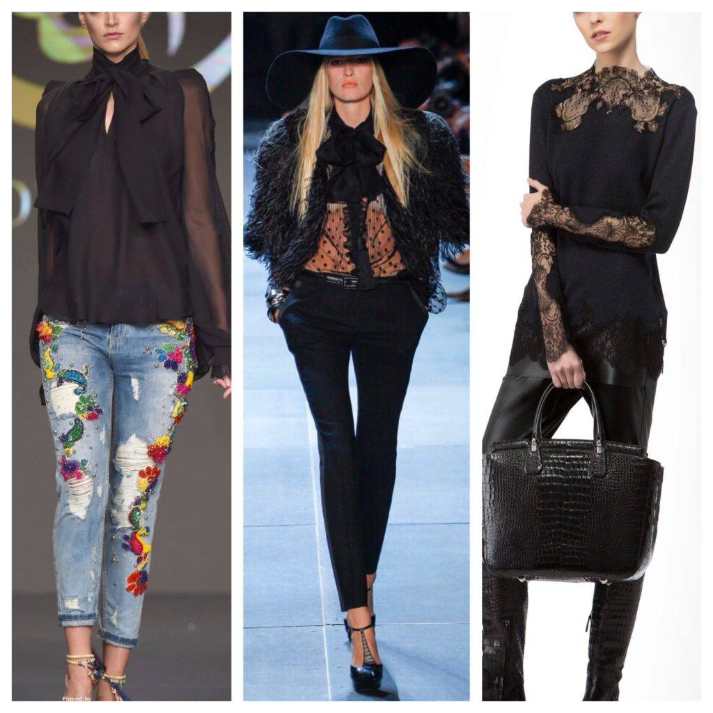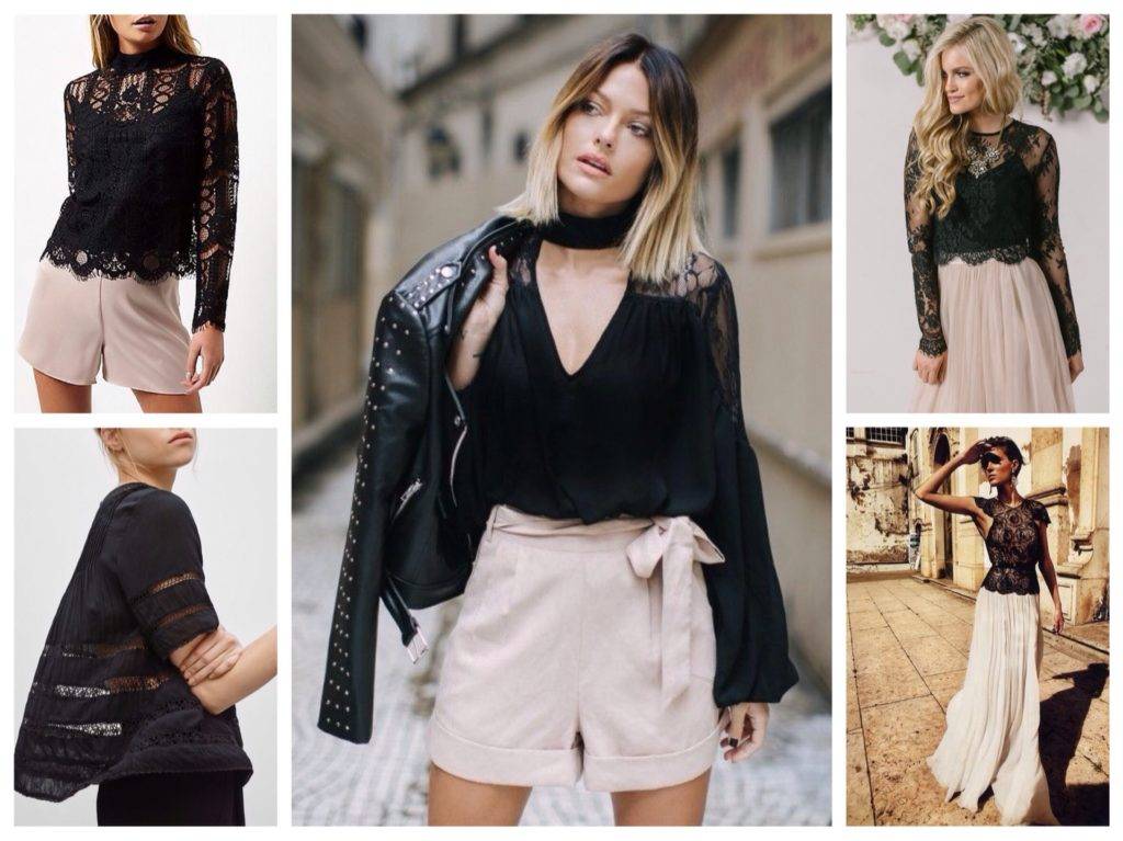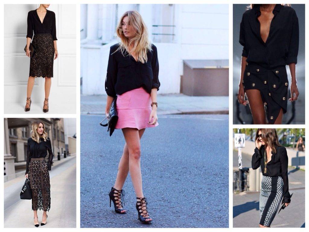 Важная особенность подобного элемента одежды — ее универсальность, это хорошо заметно на фото. Она уместна в деловом и повседневном стиле, с ее помощью легко создать интересный гранж или рокерский образ. Она также сочетается с джинсами и классическими костюмами, как и белая. А если модель шелковая или прозрачная, украшенная декором, то она вполне подходит для вечернего выхода.