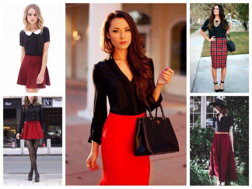 Можно носить с красной юбкой-карандаш или другого силуэта, но надо помнить, что такой образ получается довольно активным. Не каждая женщина почувствует себя комфортно в подобной одежде.