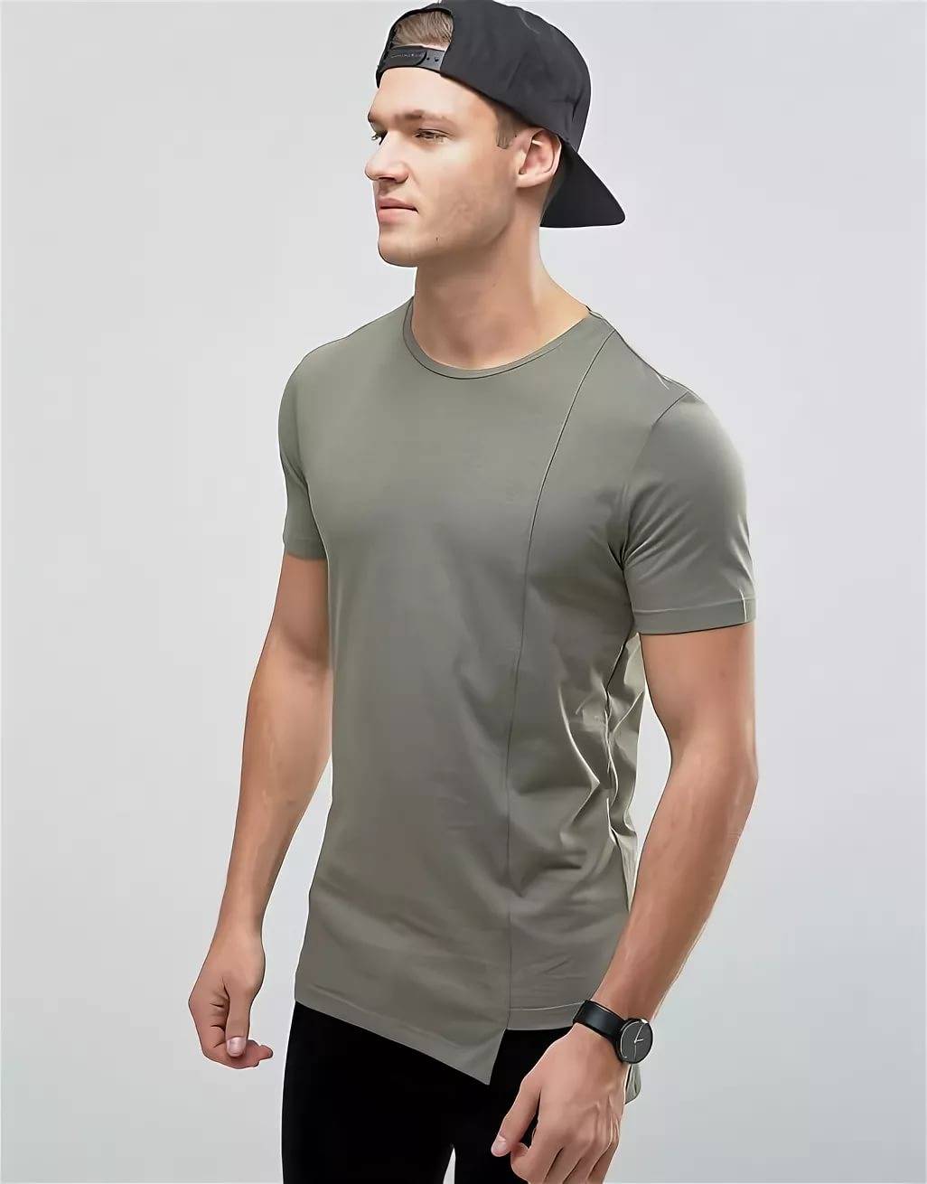 - Асимметричность низа. Эта довольно смелая тенденция демонстрирует свободу от условностей классических линий и форм. Всем своим видом мужчина в футболке такого кроя показывает окружающим свою уникальность, неповторимость, отсутствие страха нарушить традиции.