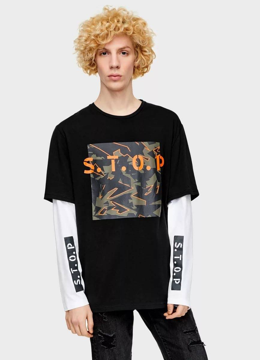 - Многослойность. Модели с этим эффектом создают впечатление, что мужчина второпях надел одну футболку на другую. Образ выглядит достаточно небрежно, но модно.