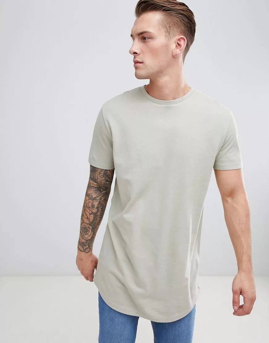 - Длина до середины бедра. Являясь классикой стиля casual, такая модель мужских футболок 2020 года идеально впишется в гардероб каждого модника вне зависимости от строения фигуры. В совокупности с легкими брюками придаст свободу движениям, позволит чувствовать себя комфортно, уверенно.