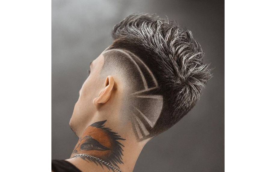 - Узоры. Выполненные машинкой рисунки на волосах сделают любую стрижку мега-модной и оригинальной. Такой вариант прически вариативен, особенно если мастер умеет сочетать сразу несколько барбер-техник.