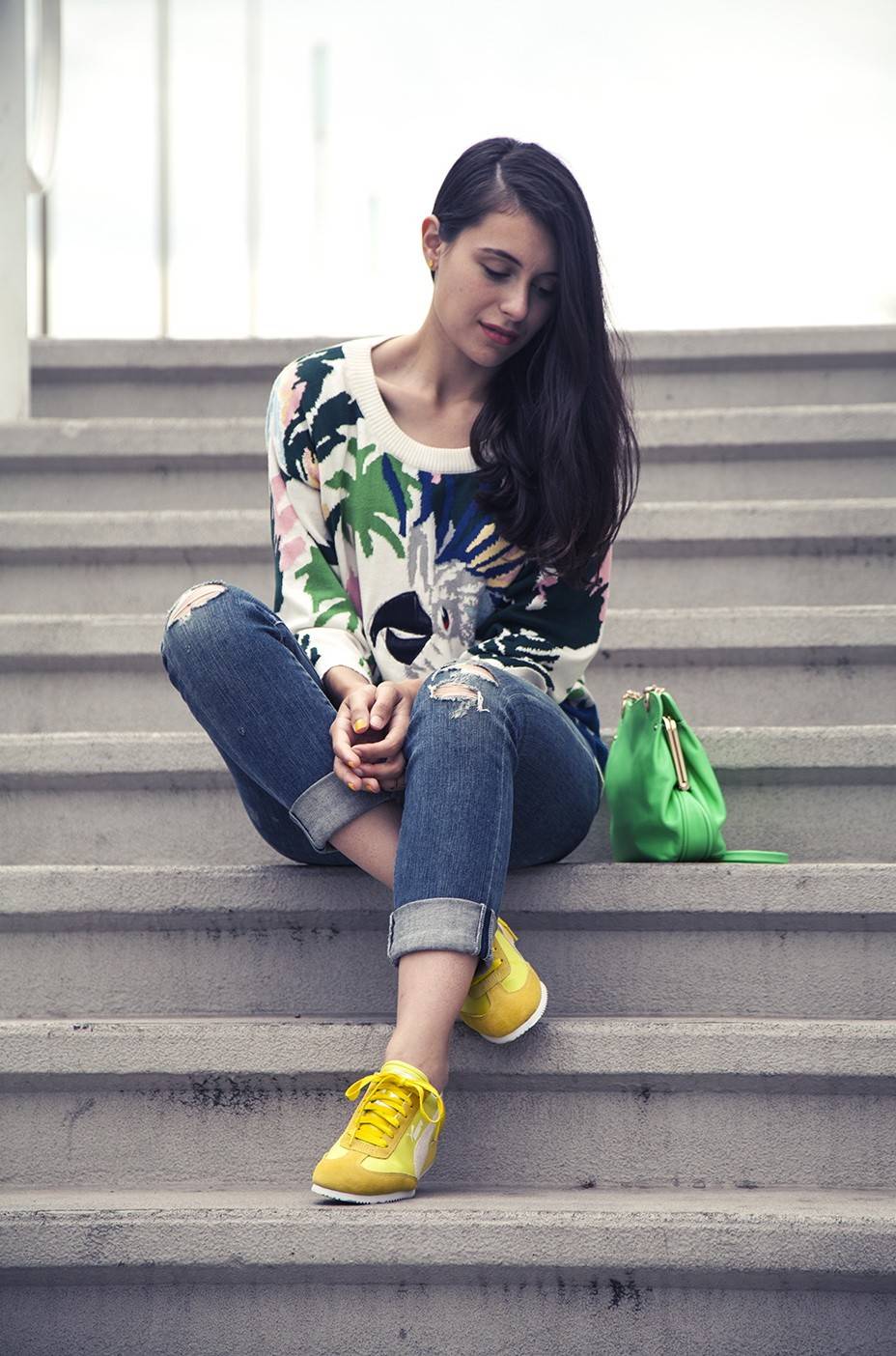 Отлично обыграть и скомбинировать образ поможет сочетание цвета кроссовок с орнаментом на одежде. Хорошо дополняют наряд аксессуары, контрастные или желтые, – сумка, очки, платок, шляпа, пояс. Достаточно одного акцента, чтобы look заиграл нужными красками.