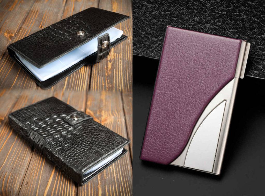 Это аксессуары, предназначенные для хранения печатной продукции других. Мужская визитница (не следует путать с картхолдером, который используется для хранения собственных визиток) является частью стиля. Женщины для этих целей используют и пластиковые варианты, но у мужчин чаще можно увидеть кожаные изделия. Изысканно смотрится визитница из кожи крокодила и других видов натурального материала. С надежностью и презентабельностью ассоциируется и металлическая визитница в руках мужчины.