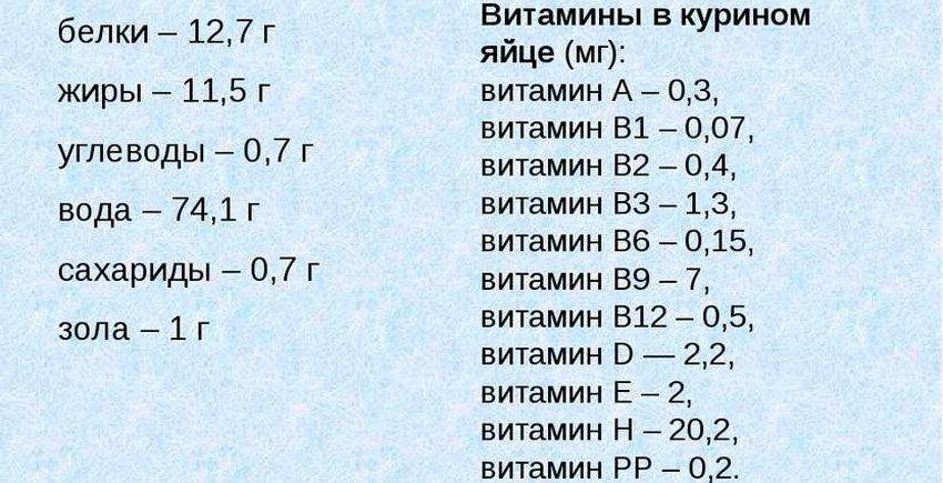 Точное содержание белков, жиров и углеводов зависит от массы яйца. Средние значения в граммах: