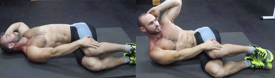 Техника выполнения: ложимся на пол, на бок, нижнюю ногу немного поджимаем под себя, верхняя нога прямая, рука правая или левая (в зависимости от того на каком боку лежим, допустим на правом). Нижнюю руки выкидываем перед собой, и как бы упираемся ею в пол, ладонь правой руки кладём на затылок, и скручиваемся так, как бы пытаемся дотянуться локтём до колен.