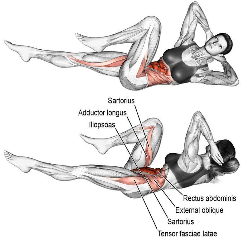 Такая вариация позволяет акцентировать нагрузку на нижней части мускулатуры пресса. В исходном положении вы лежите на спине, а ваши ноги подняты вверх и согнуты в коленях под прямым углом. Руки можете развести в стороны для поддержания равновесия. Отводите колени поочередно вправо-влево, следя за тем, чтобы в пояснице не образовывался прогиб.