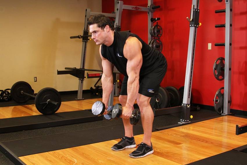 - Тяга гантели к поясу каждой рукой поочередно. Количество повторов и подходов считаем для каждой руки.