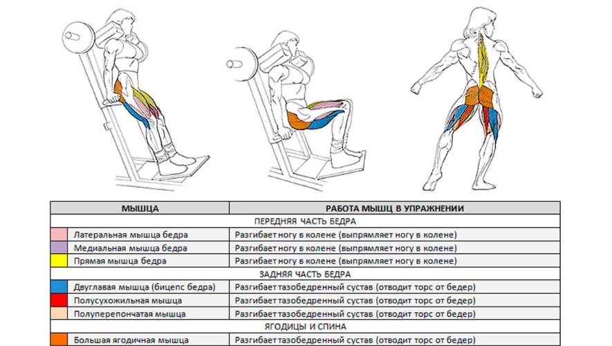 Воздействие на мышцы: Ягодицы : Большая ягодичная мышца. Бедра квадрицепс : Широкая медиальная Бедра квадрицепс : Широкая латеральная Бедра квадрицепс : Прямая мышца бедра Спина : Разгибатель позвоночника Бедра бицепс : Двуглавая мышца бедра Бедра бицепс : Полусухожильная Бедра бицепс : Полуперепончатая |