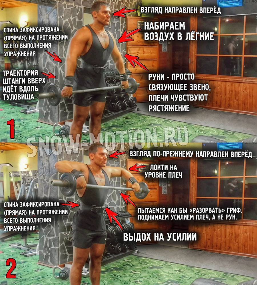 На вдохе напрячь мышцы трапеции и шеи, развести локти и потянуть их вверх. Гриф скользит вдоль туловища от бедер до подбородка. Задержаться в верхней точке, максимально напрягая рабочие мышцы. Локти в верхней точке должны быть выше плеч.