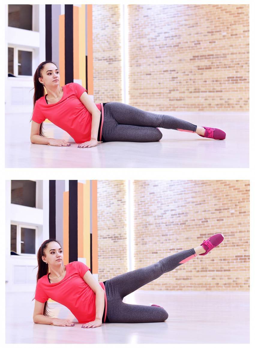 | 2 | Махи | Лягте на правый бок, правой рукой поддерживайте голову, оперившись локтем в пол. Левую руку положите на талию. Выполняйте махи ногами: левую ногу поднимите на 90 градусов вверх и медленно опустите. Затем перевернитесь на другой бок и повторите другой ногой. | 3-5*20-25 (на каждую ногу) |