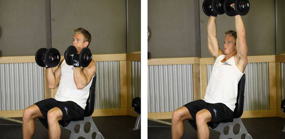 Сев на скамью, расположите кисти с гантелями перед плечами, как будто только закончили подъем на бицепсы. Ладони обращены на себя. Поднимите гантели над головой, вытянув руки и развернув ладонью вперед. Задержитесь на некоторое время и верните гантели к плечам, повернув ладонь к себе.
